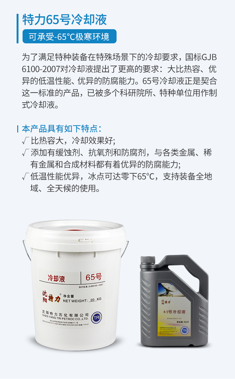 該產品符合國軍標GJB6100-2007執行標準。除了65號之外,特力還提供冷卻液的標號、包裝定制功能:包括40號、45號、50號、60號以及4kg、20kg以及客戶所需包裝服務,歡迎咨詢
