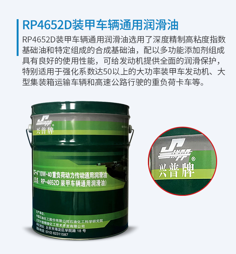 RP4652D裝甲車(chē)輛通用潤(rùn)滑油選用了深度精制高粘度指數(shù)基礎(chǔ)油和特定組成的合成基礎(chǔ)油,配以多功能添加劑組成。RP-4652D裝甲車(chē)輛潤(rùn)滑油具有良好的使用性能,可給發(fā)動(dòng)機(jī)提供全面的潤(rùn)滑保護(hù),特別適用于強(qiáng)化系數(shù)達(dá)50以上的大功率裝甲車(chē)發(fā)動(dòng)機(jī)、大型集裝箱運(yùn)輸車(chē)輛和高速公路行駛的重負(fù)荷卡車(chē)等。