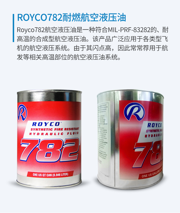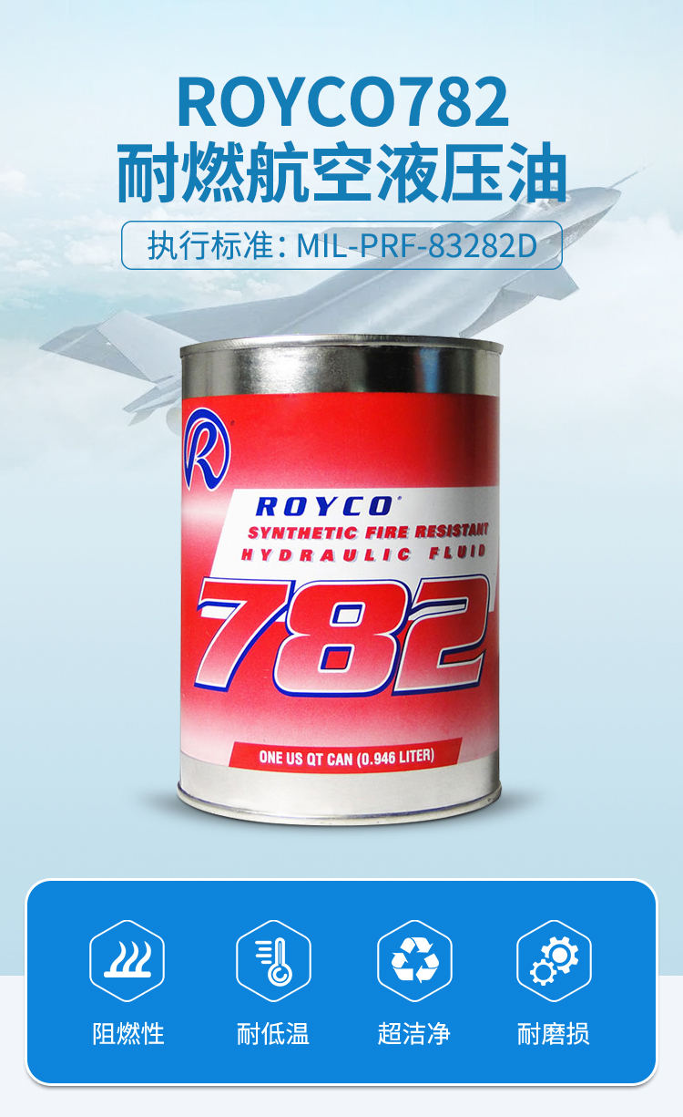 MIL-PRF-83282D是mei軍標合成型耐高溫液壓油的技術規格。符合該標準的液壓油都屬于高溫抗燃液壓油。以Royco782為例,其使用部位一般都是暴露于高溫環境下的部位。