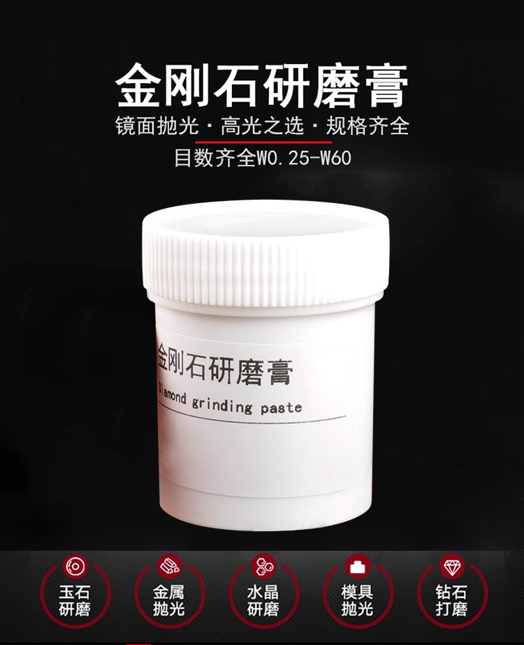 金剛石研磨膏適用于翡翠、瑪瑙、水晶、玉石,琥珀等工藝品、陶瓷硬質合金等高硬度材料制品的量具、刃具光學儀器及其他高光潔度工件的研磨,拋光加工。