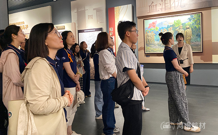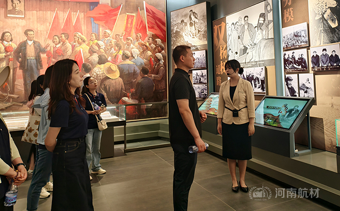 在描繪蘭考鹽堿大地舊貌的地圖前,在陳列泛黃黨報的展柜旁,員工們駐足細覽。